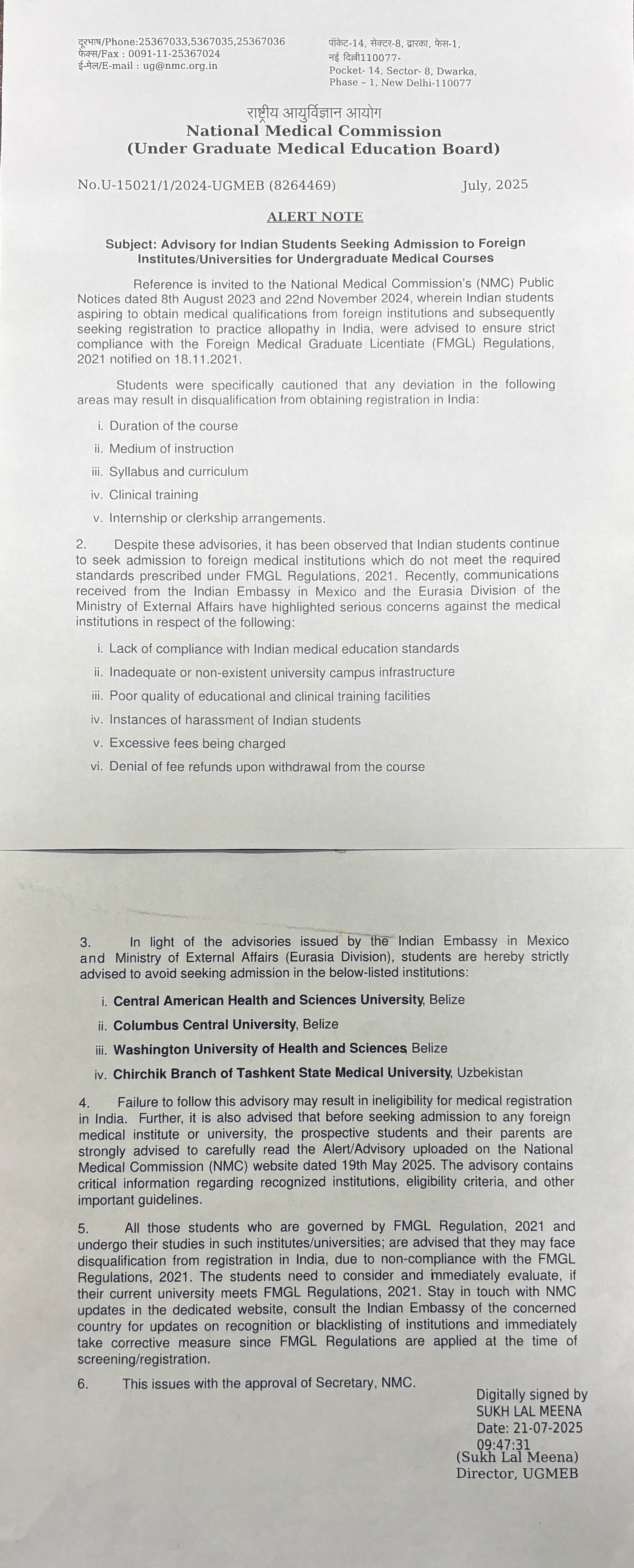 Regarding - Advisory for Indian Students Seeking Admission to Foreign Institutes/Universities (Central American Health and Sciences University, Belize) for Undergraduate Medical Courses